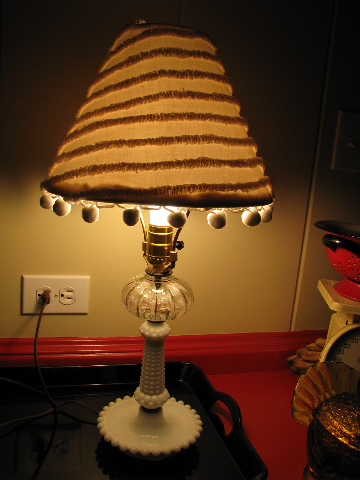 I took the girl’s lamp and re-vamped it for my 1950s look. I got the chenille bedspread out of the trash (some poor creature had tossed it out not thinking about all that CRAFTING you can do with it), so it was free, and the lamp was my Mamaw’s, I think, and really all I purchased was the shade and the ball fringe (WallyWorld). I am posting a video so you can see how I did this. I did tuck the fabric back up into the shade on the edges (should have trimmed it more, but oh well), and lastly I hot glued the ball fringe on the inside of the shade. Originally the shade was just a plain white number, but somehow it got a greasy stain on it, and I am kinda glad that it DID, otherwise I probably wouldn’t have thought to re-cover it.