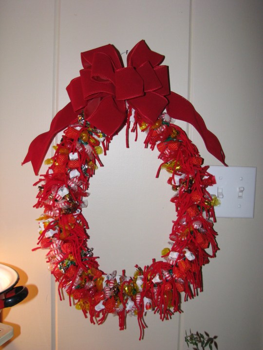 So super easy to make! I bought 2 – 3# bags of hard candy @ Dollar General for about 6 bucks. The hanger was free and the ribbon was a dollar for 9 yards at Wal Mart. I am going to post the how-to video, but may I say first that I deviated from the instructions (what a shock!) and did not clip off the ‘hanger’ part of the hanger (why create extra work???) and just simply did no wire cutting and used the ‘hanger’ part to hang up the wreath. My wreath came out looking more like an oval shape, but what do you expect when you have 6 pounds of candy hanging on a little wire? Oh well, it’s still tasty.