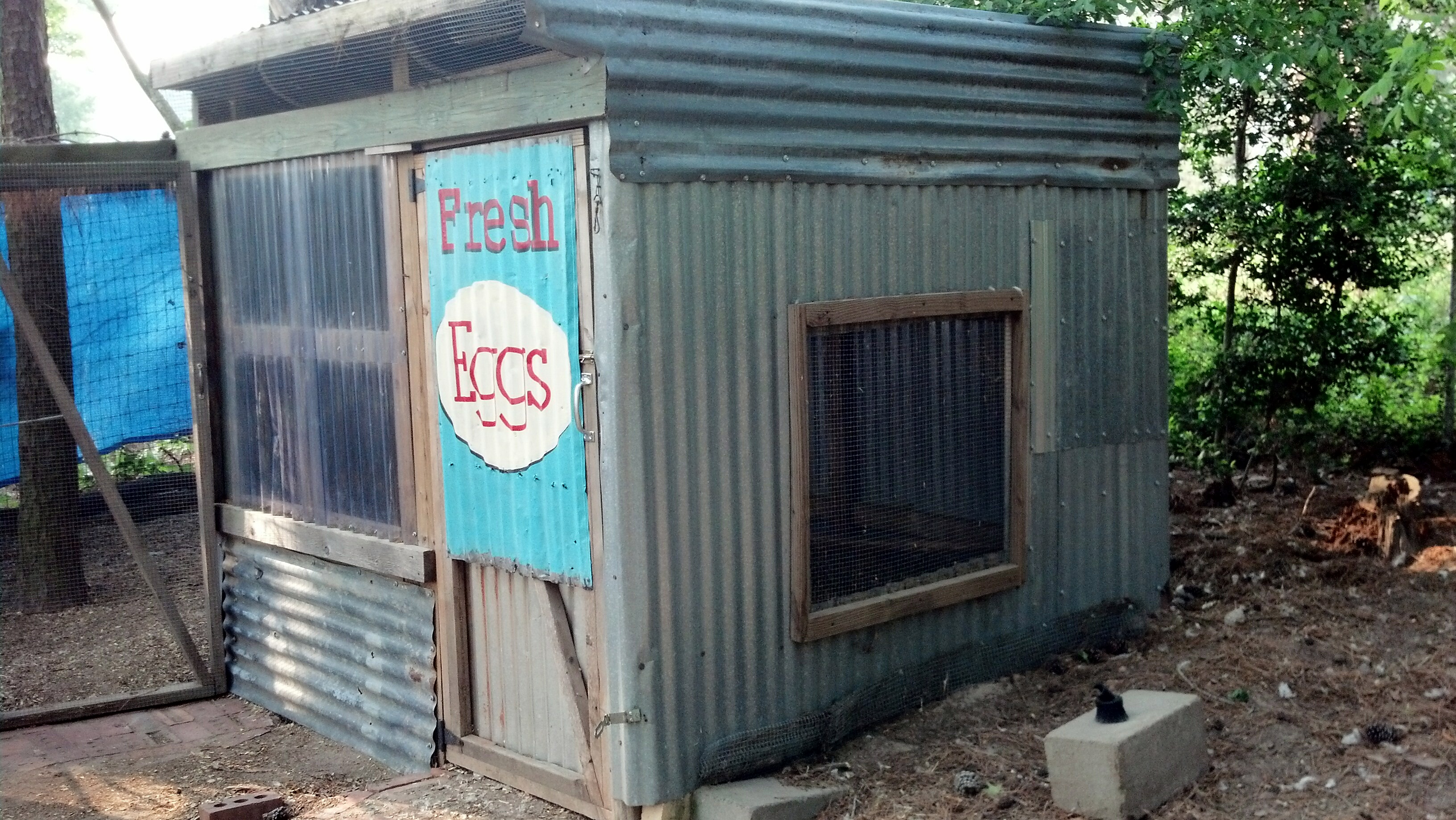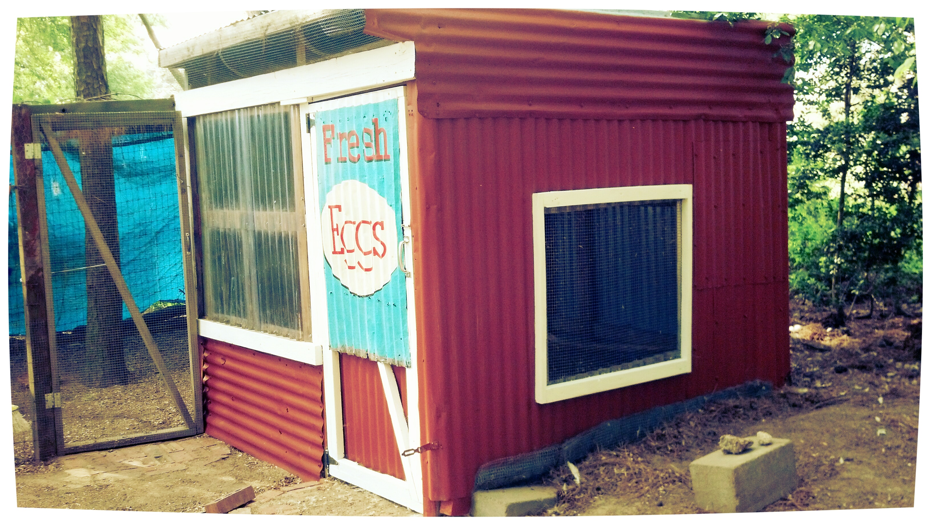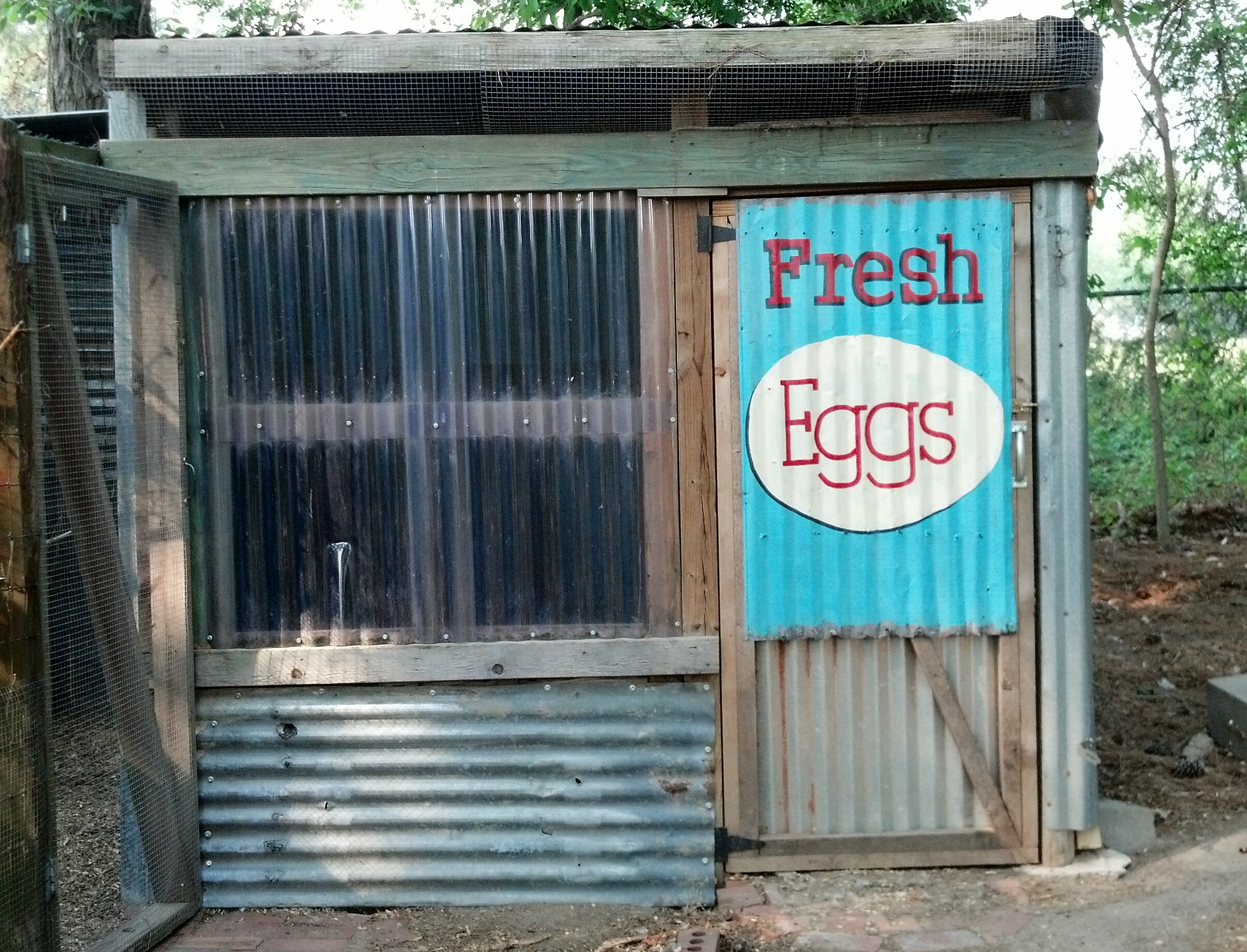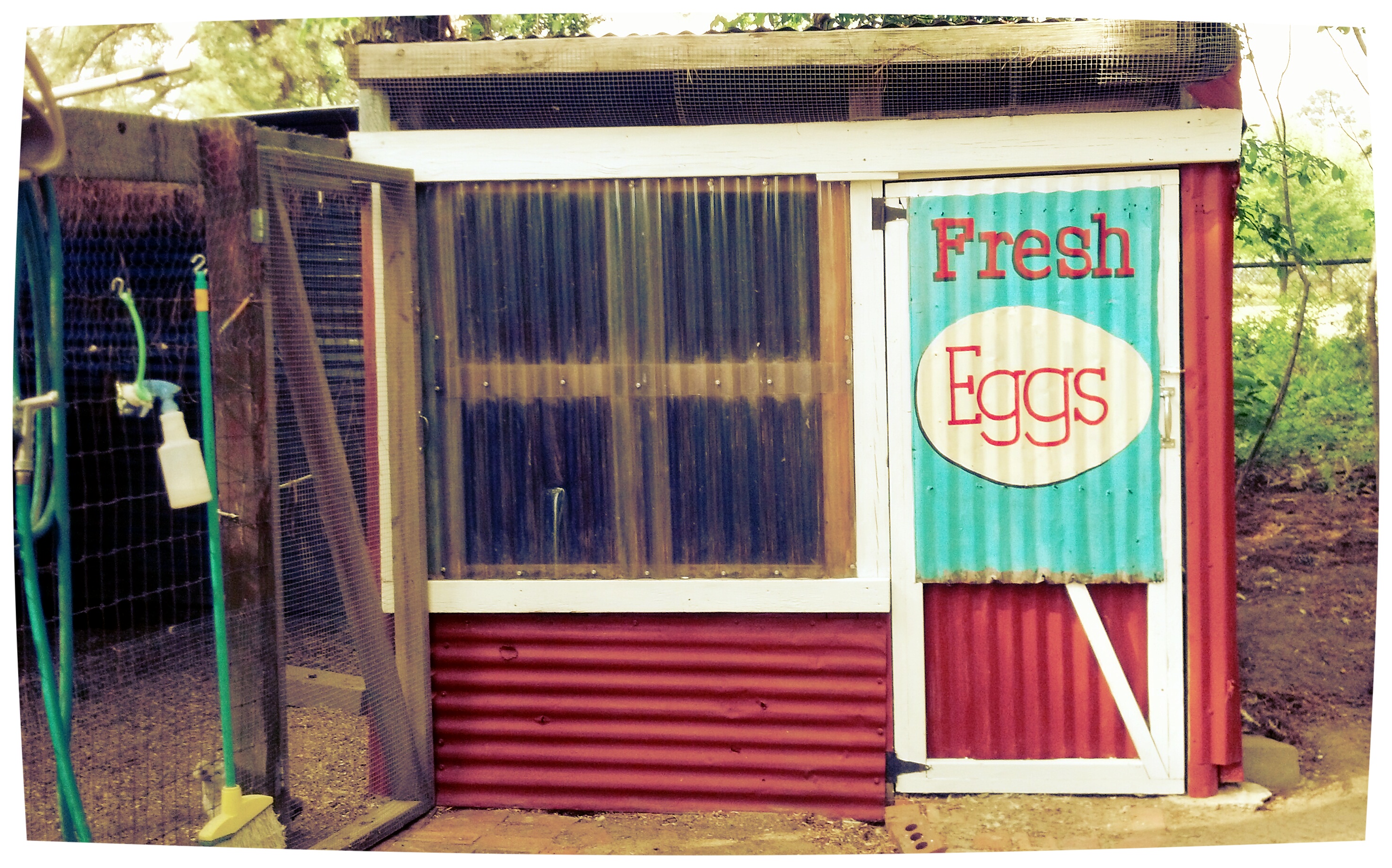 My poor chicken coop was looking pretty sad. Not that it has ever been a jewel. When we moved here, it was a 3 sided ‘loafing’ shed on its last legs. We shored it up and enclosed the front, added a sliding door to the run on the side, and a window for ventilation. It may be coon-proof, but it certainly isn’t snake-proof. It’s not the best looking thing you’ve ever seen, but it worked for us for several years until we built a secondary coop. The front, as you can see, has clear corrugated material on the front to allow light in. The egg sign was one that I designed and painted when I was selling my extra eggs at a local farmer’s market. After reading several blogs and posts about painting structures and pretty coops, yesterday I grabbed some leftover red barn paint and some white trim paint.