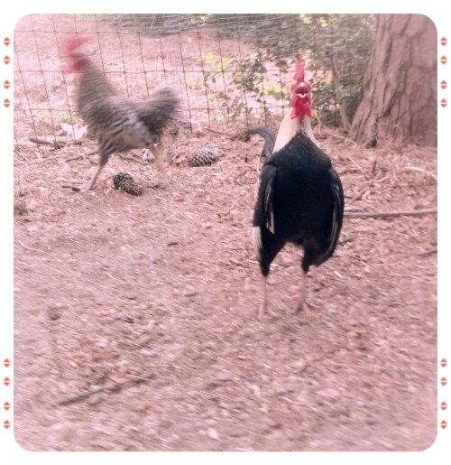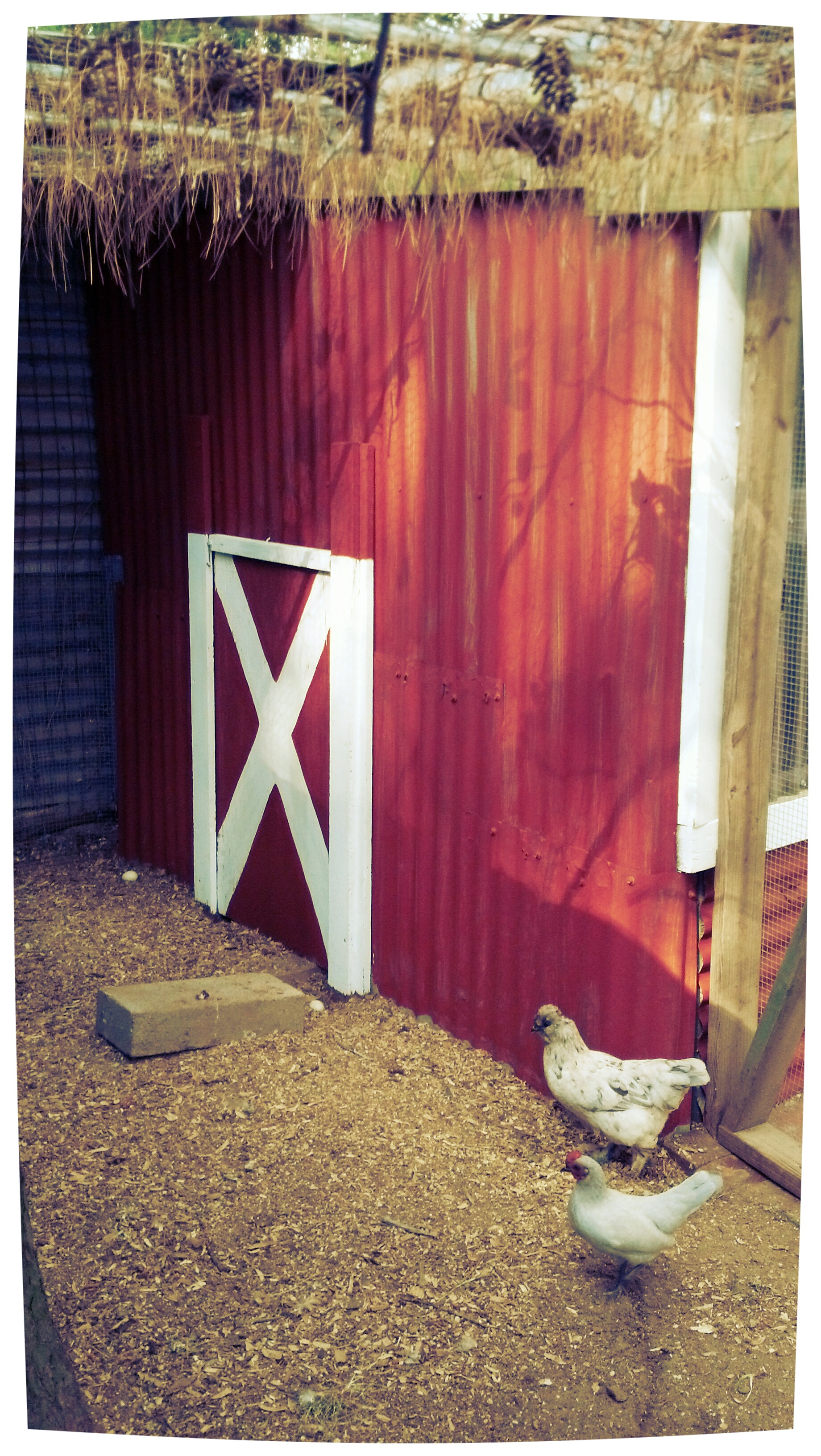 Below you can see the little sliding door. I painted a little ‘X’ on the door to match the front door somewhat. I really like it. You can see little Dolly Banty and our Old English Gamebird/Silkie cross checking it out.