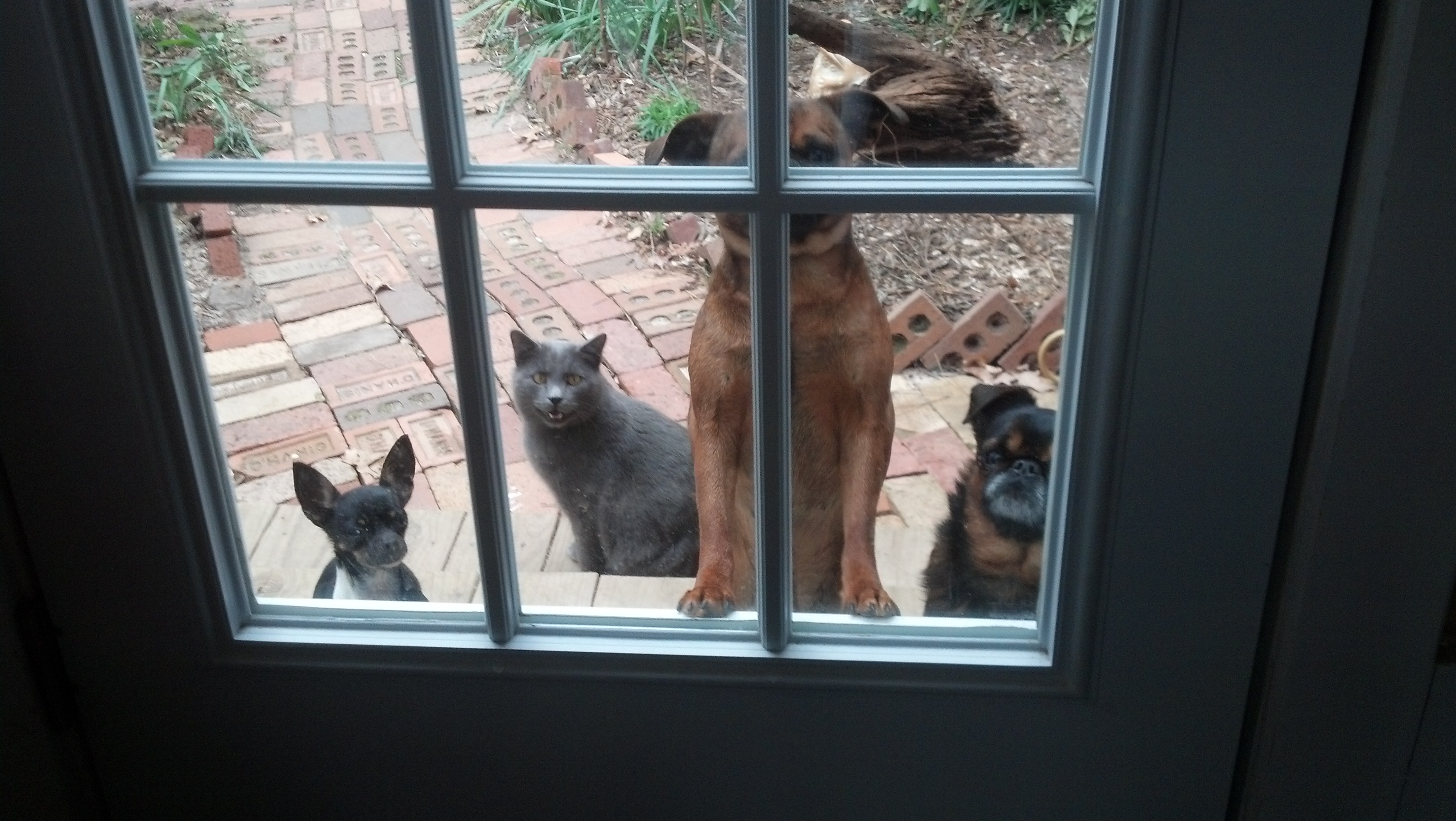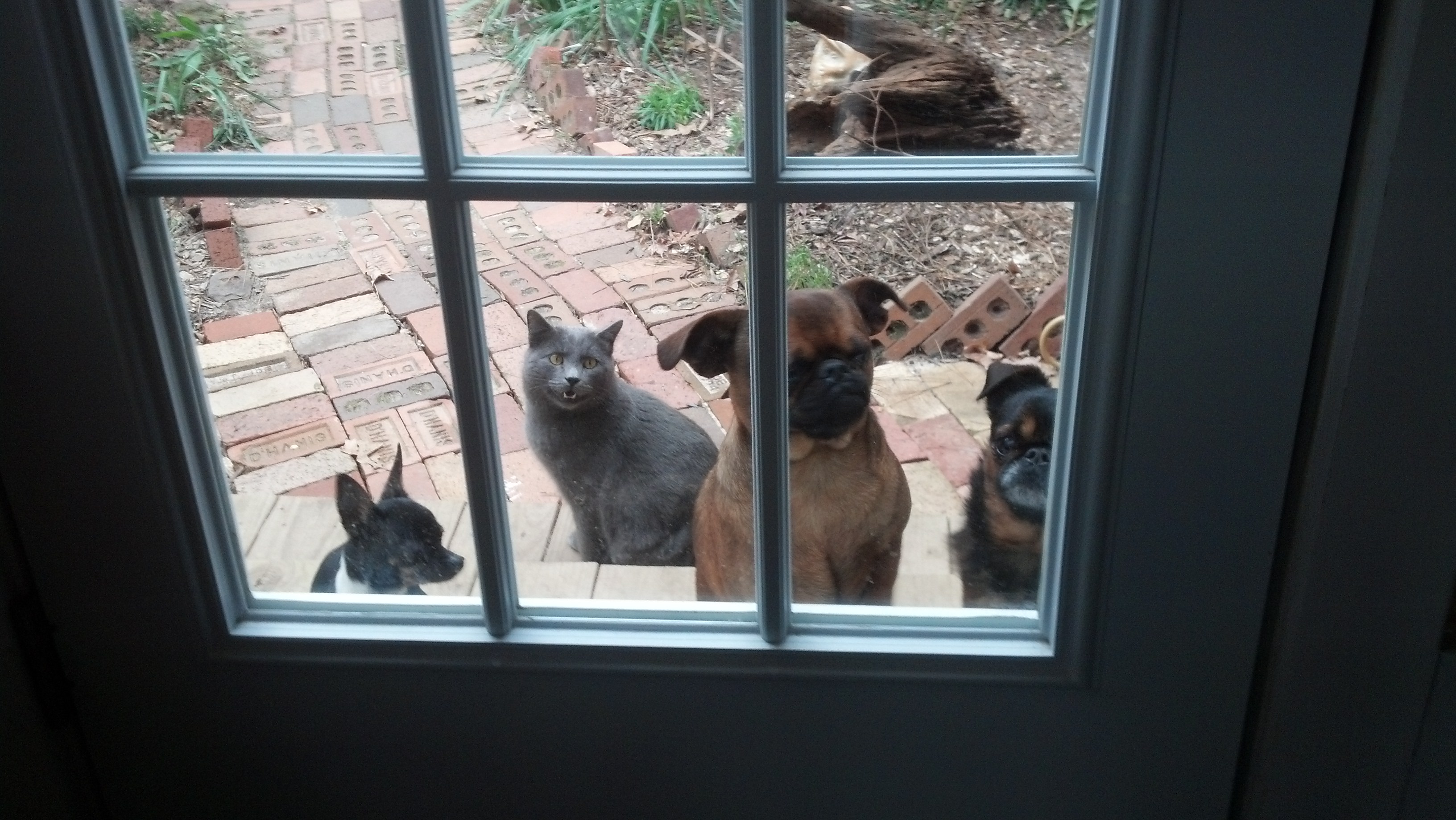 I think potty break time is over, don’t you? Looked out the side door to see this motley crew staring at me with their most pathetic little looks. Don’t worry, it worked. They were back in the house hogging up space in front of the heater right after I snapped these photos. How could anyone say no to those mugs?