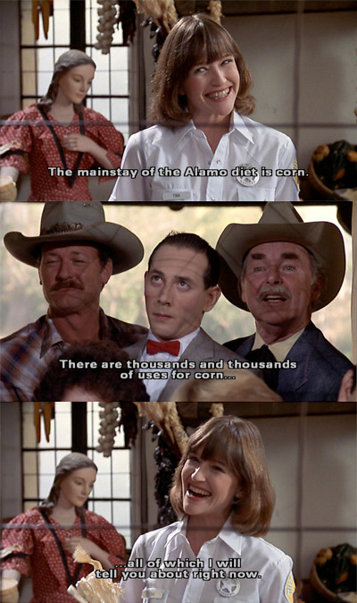 This reminds me of the Alamo scene in Pee-Wee’s Big Adventure where Pee-Wee finally makes it to the Alamo to look for his beloved stolen bicycle. He was told that his bike is in the basement of the Alamo, so he buys a ticket for the tour. The effervescent and irrepressible tour guide, Tina, (played by Jan Hooks) goes into a description of the Alamo as a visibly impatient Pee-Wee attempts to contain his anxiety as they view different rooms. But the gem…the ABSOLUTE GEM of a line is when they make it to the kitchen where Tina begins to talk about corn. The line is “There are thousands and THOUSANDS of uses for corn, all of which I will tell you about right now!”