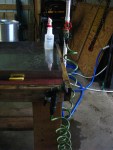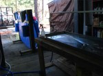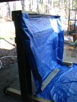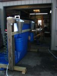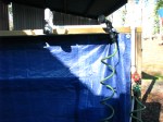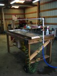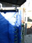 On the cone/plucking station, on one side we used 16″ tall flashing to create cones with the bottom openings just large enough for a chicken’s neck to fit into. Next time, we are going to also include some ‘c’ clamps at the top to hold the chickens’ feet in place as they can even still manage to squirm their legs enough to get down into the cones (they are probably a bit too wide). On the other side, there are 2 sets of chicken leg sized slots that were cut into the top beam. The legs fit in the slots perfectly (we used a live chicken and measured its legs), and the feet prevent the bird from slipping out. On one set of slots, we attached a showerhead above it so that we can turn it on to help rinse feathers downward when needed, into the tarp. The hand sprayer and showerhead are, again, plumbed independently so you can operate them separately.