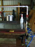 Each station has its own handheld sprayer with its own sprayer dock so that you are not stumbling over hoses or trying to balance your sprayer where you’re not going to get soaked with it. Trust me, been there, done that, and been soaked down WAY too many times to NOT have a reliable sprayer and a sturdy sprayer dock. All it is, is a little ‘c’ clamp so the sprayer handle hooks into it. On the Evisceration Station, the PVC bar across the top is drilled at the bottom with small holes. The red handle operates this flow, so you can turn it on independently of your sprayer. It helps to keep blood, feathers, etc. flowing towards the center drain, which empties into a 5 gallon bucket. Since the bucket fills up too quickly, we are going to put a screen at the bottom, add a PVC ‘drain tube’ out of the bottom side of the bucket. So, it will keep the funky stuff in and allow the water to escape.
