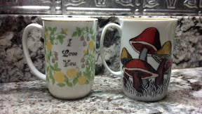 Then she brought me an estate sale find. A vintage Neiman Marcus coffee mug covered in……mushrooms. I love mushrooms and I love owls. I now have mugs with both! It is strikingly similar to my other favorite mug: