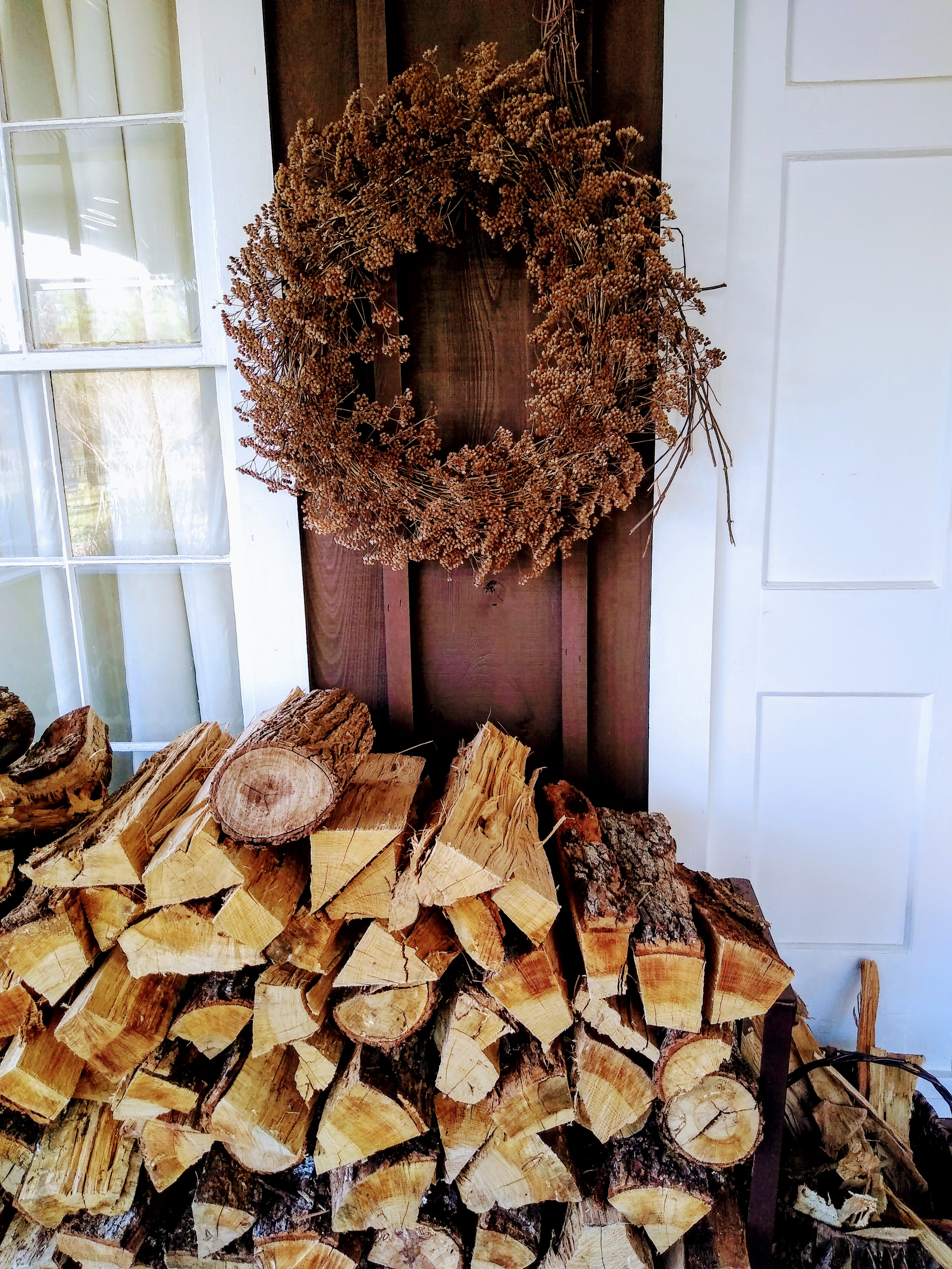 Let’s chat about more pleasant things, though. Though this season is fairly blah in the garden and outdoors, there are still beautiful things around. One of the best things is firewood, and a heck of a lot of it. We brought up a lot for this storm and put it on the porch. Side note: Jason and I made grapevine wreaths and swags this spring, and then I gathered the yarrow you see here and made this wreath. You can’t tell, but it’s painted a deep gold with some gold glitter.