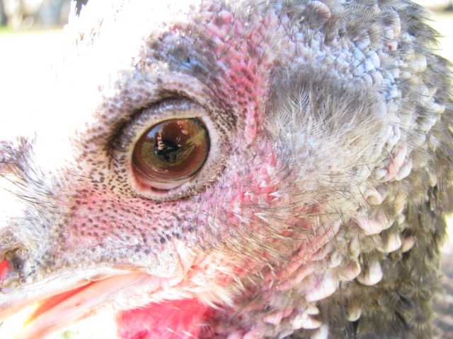 Anyway, so the turkeys are huge, lumbering, hungry critters. Yes, they will barrel down upon you for food, and you’d just better have some handouts, that’s for sure. One fine June day, I was in their pen (after feeding them, of course), and I discovered that their water bin had shifted and needed a little help. Well, the turkeys had finished gulping down their meal, and now all eyes (*huge, huge, hungry eyes*) were upon me. As I was fiddling with the stupid water pan and splashing turkey mess all over myself, the largest tom (with the largest eyeballs) snatches my glasses. Yes, right offa my face. And he runs. Fast.
